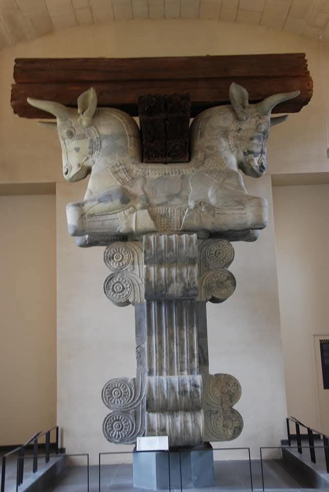 تاج عمود ضخم برؤوس ثيران مزدوجة وتظهر الثيران ظهراً إلى ظهر، كانت توضع على قمة عمود نحيف يبلغ طوله حدود 60 قدماً، عثر عليه في مدينة سوسة/إيران يعود تاريخها إلى القرن الرابع قبل الميلاد، محفوظ حالياً في متحف اللوفر.