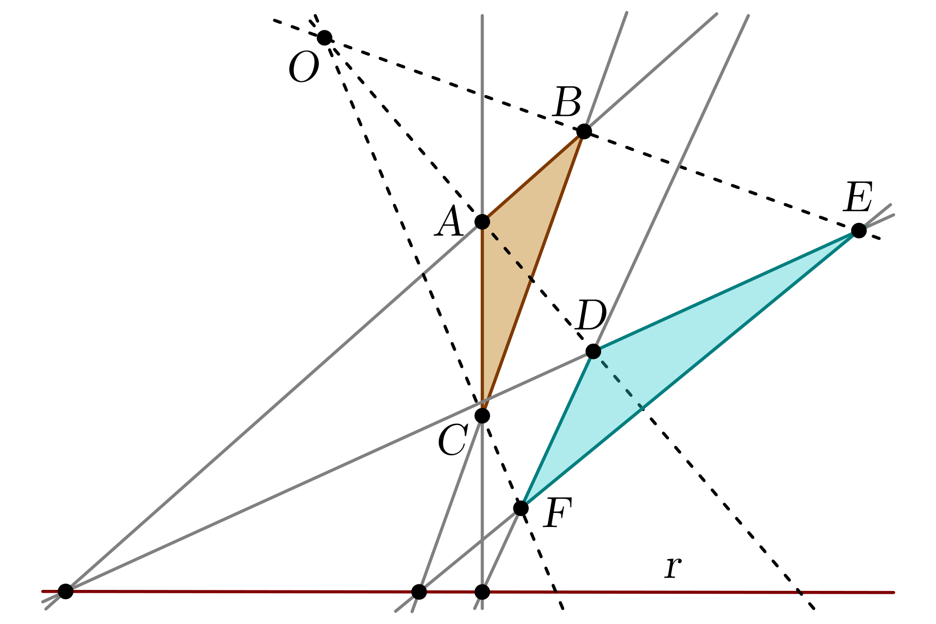 تظهر الصورة مبرهنة ديسارغو. أحد أبرز الملاحظات في المبرهنة هو أن جميع المستقيمات تتلاقى عن نقطة واحدة، أي أنه لا يوجد مستقيمات متوازية.