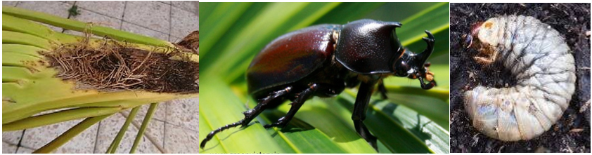 اعراض الإصابة: وجود حفر في اصول (قواعد) السعف (الكرب) وفي قمة النخلة حيث تتغذى على انسجتها الداخلية فتسبب موتها.