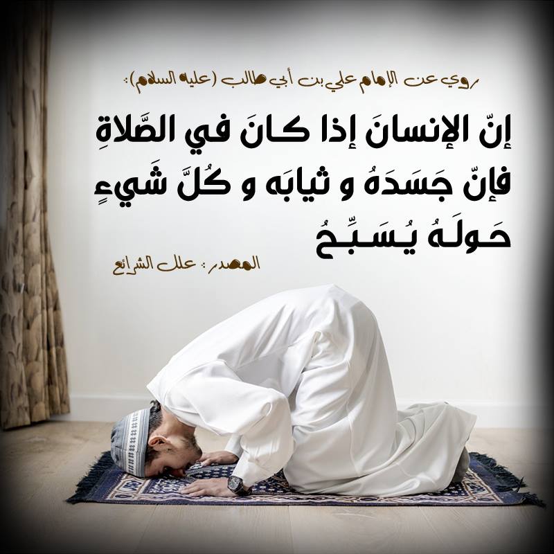 رُوِيَ عَنْ الإمام عَلِيِّ بْنِ أَبِي طَالِبٍ ( عليه السَّلام ) أنهُ قَالَ : إنّ الإنسانَ إذا كانَ في الصَّلاةِ فإنّ جَسَدَهُ و ثيابَه و كُلَّ شَيءٍ حَولَهُ يُسَبِّحُ .