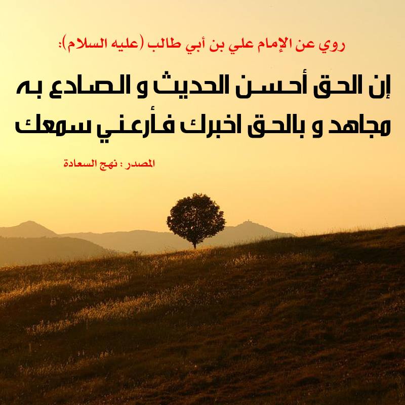 الإمام عَلِيِّ بْنِ أَبِي طَالِبٍ ( عليه السَّلام ) أنهُ قَالَ : إنَّ الحقَّ أحْسَنُ الحَديثِ ، و الصّادِعُ بهِ مُجاهِدٌ ، و بالحقِّ اُخبِرُكَ فأرْعِني سَمعَكَ .