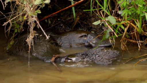 Both sorts of burrows keep their entrances at, slightly above, or below water level, the entrance tunnel climbing at an angle a few feet above water level to prevent flooding of the burrow. The openings can be difficult to spot, since platypus prefer to build them as hidden as possible in sturdy, concave banks with reeds and other aquatic plants at the water edge, and overhanging sod and tree roots.