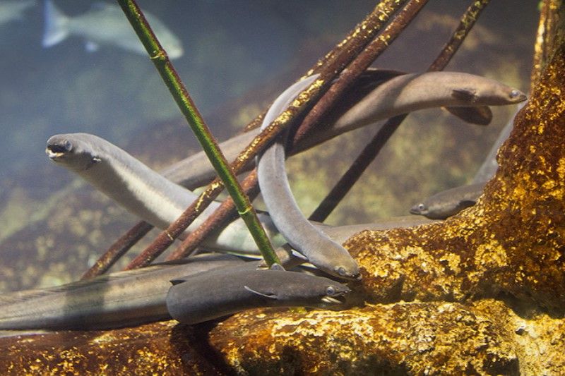 As the eels enter freshwater systems, they transform again, gaining pigmentation and becoming known as “elvers.” For the next six to 20 years, the eels put on weight and length while also developing lemon-colored undersides. This is what’s known as the “yellow eel” stage. Yellow eels travel continuously upstream toward cooler, less salty water until they become reproductively mature.