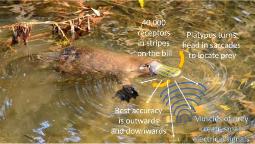 In the platypus, the combined abilities of electroreception and mechanoreception are so sensitive and detailed that they have become something like vision, providing a three-dimensional "view" of the platypus underwater world, and enabling the platypus to pinpoint, in all three dimensions, the exact locations of its prey.