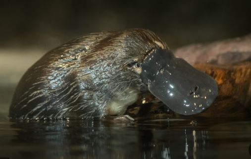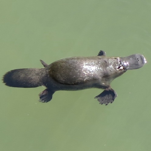 The platypus feeds by snagging swimming creatures with its bill and by rousting them out of stream bottom mud and gravel, shoveling it up with its bill to put buried creatures to flight, then catching them as they try to escape.
