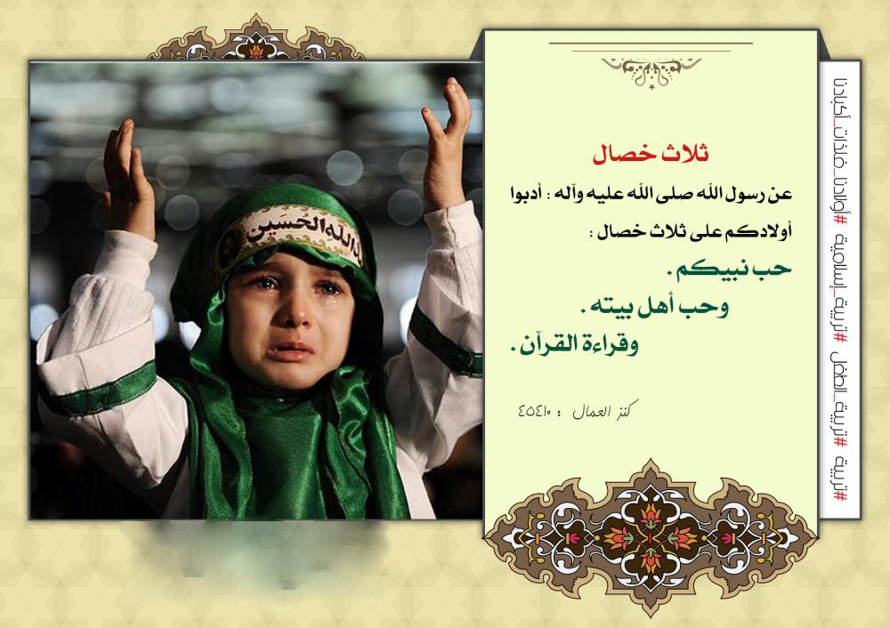روي عن رسول الله (صلى الله عليه وآله) انه قال: (أدبوا أولادكم على ثلاث خصال: حب نبيكم، وحب أهل بيته، وقراءة القرآن) خلاصة عبقات الأنوار ج4 ص255.