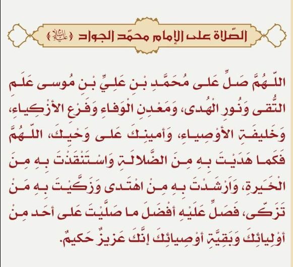 "اَللّـهُمَّ صَلِّ عَلى مُحَمَّدِ بْنِ عَلِيِّ بْنِ مُوسى عَلَمِ التُّقى وَ نُورِ الْهُدى، وَ مَعْدِنِ الْوَفاءِ وَ فَرْعِ الاَْزْكِياءِ، وَ خَليفَةِ الاَْوْصِياءِ، وَ اَمينِكَ عَلى وَحْيِكَ ، اَللّـهُمَّ فَكَما هَدَيْتَ بِهِ مِنَ الضَّلالَةِ وَ اسْتَنْقَذْتَ بِهِ مِنَ الْحَيْرَةِ، وَ اَرْشَدْتَ بِهِ مِنْ اهْتَدى وَ زَكَّيْتَ بِهِ مَنْ تَزَكّى، فَصَلِّ عَلَيْهِ اَفْضَلَ ما صَلَّيْتَ عَلى اَحَد مِنْ اَوْلِيائِكَ وَ بَقِيَّةِ اَوْصِيائِكَ اِنَّكَ عَزيزٌ حَكيمٌ".