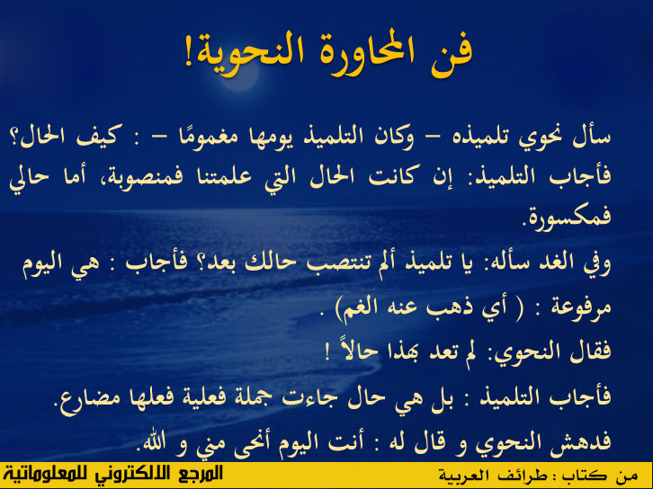 | هذا حال النحو يوما موجود ويما غائب ، يوما حال ويوما محال.... احسنت صديقي العزيز. | أعجبني |