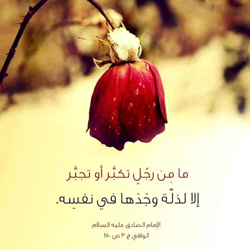 عن الإمام الصادق عليه السلام : (ما من رجل تكبّر أو تجبّر إلا لذلّة وجدها في نفسه) غرر الحكم ودرر الكلم لآمدي ص668.