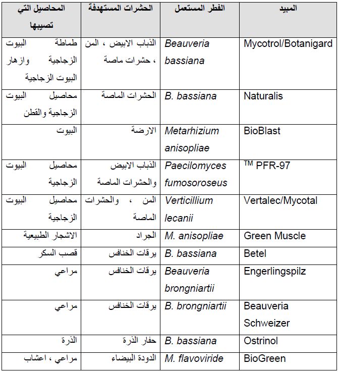 مبيدات فطرية تستعمل لمكافحة الافات وخاصة الحشرات وتبدأ عملها عند ملامسة الكيوتكل Cuticle اي بمجرد ملامسة الحشرة . وتكون الحاجة ماسة للمبيدات الفطرية لمكافحة الآفات الرعوية للحيوانات في المناطق المفتوحة حيث يكون استعمال المبيدات الكيماوية غير ممكن عمليا ومكلفا ومنها المذكورة في الجدول الاتي :