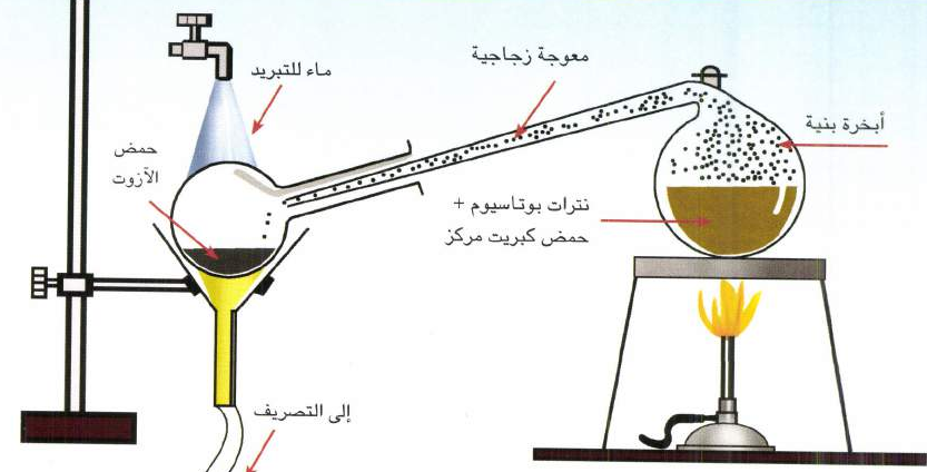 - ينتج حمض النتريك من الأكسدة التحفيزية للامونيا حين يؤكسد غاز الامونيا إلى أكسيد النتريك وثنائي أكسيد النتريك بواسطة الأكسجين وفي وجود شبكة تحفيزية من البلاتين.
