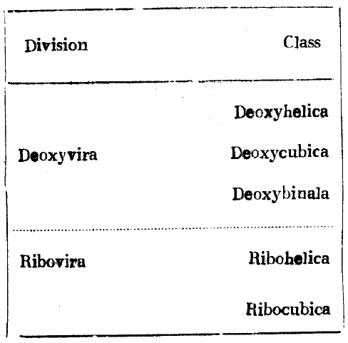 وبناء على ذلك فان الفيروسات الحيوانية والبكتيرية توضع في قبيلة واحدة phylum يطلق عليها اسم vira وتقسم القبيلة إلى تحت قبائل subphyla (اقترح فيما بعد استخدام divisions) وصفوف classes ورتب orders وعائلات families وأجناس genera وأنواع species.