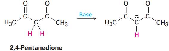 The 2,4-pentanedione anion has a lone pair of electrons and a formal negative charge on the central carbon atom, next to a C=O bond on the left. The O=C-C:- grouping is a typical one for which two resonance structures can be drawn.
