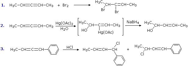 Some other addition reactions to allenes are shown in the following equations. The first example demonstrates that bromine adds readily to one of the allene double bonds. The inductive effect of the halogens retards addition of a second equivalent of bromine, but this may take place under more forcing conditions. The oxymercuration example results in nucleophile (water) bonding to a terminal carbon, probably because SN2 opening of the cyclic mercurinium intermediate is favored at that site. The last example is interesting because it shows that independent stabilization of a terminal carbocation, e.g. by benzyl resonance, changes the initial site of electrophilic attack to the central (sp-hybridized) carbon. The resulting stabilized cation may then achieve further stabilization by rotating to conjugate with the remaining double bond. The two isomeric addition products shown here come from nucleophile bonding at both ends of the resulting allyl cation intermediate.