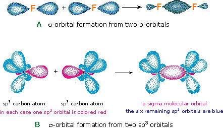 The notation used for molecular orbitals parallels that used for atomic orbitals. Thus, s-orbitals have a spherical symmetry surrounding a single nucleus, whereas σ-orbitals have a cylindrical symmetry and encompass two (or more) nuclei. In the case of bonds between second period elements, p-orbitals or hybrid atomic orbitals having p-orbital character are used to form molecular orbitals. For example, the sigma molecular orbital that serves to bond two fluorine atoms together is generated by the overlap of p-orbitals (part A below), and two sp3 hybrid orbitals of carbon may combine to give a similar sigma orbital. When these bonding orbitals are occupied by a pair of electrons, a covalent bond, the sigma bond results. Although we have ignored the remaining p-orbitals, their inclusion in a molecular orbital treatment does not lead to any additional bonding, as may be shown by activating the fluorine correlation diagram below.