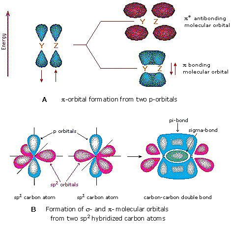 Another type of MO (the π orbital) may be formed from two p-orbitals by a lateral overlap, as shown in part A of the following diagram. Since bonds consisting of occupied π-orbitals (pi-bonds) are weaker than sigma bonds, pi-bonding between two atoms occurs only when a sigma bond has already been established. Thus, pi-bonding is generally found only as a component of double and triple covalent bonds. Since carbon atoms involved in double bonds have only three bonding partners, they require only three hybrid orbitals to contribute to three sigma bonds. A mixing of the 2s-orbital with two of the 2p orbitals gives three sp2 hybrid orbitals, leaving one of the p-orbitals unused. Two sp2 hybridized carbon atoms are then joined together by sigma and pi-bonds (a double bond), as shown in part B.