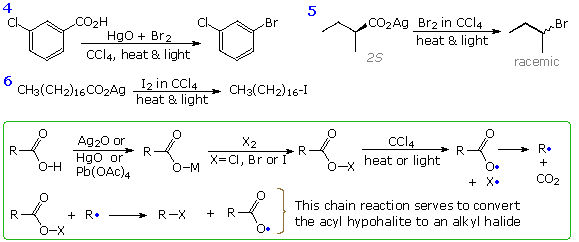Three additional examples of the Hunsdiecker reaction and a proposed mechanism for the transformation will be shown above by clicking on the diagram. Note that the meta- dihalobenzene formed in reaction 4 could not be made by direct halogenation reactions, since chlorine and bromine are ortho/para-directing substituents. Also, various iodide derivatives may be prepared directly from the corresponding carboxylic acids. A heavy metal carboxylate salt is transformed into an acyl hypohalide by the action of a halogen. The weak oxygen-halogen bond in this intermediate cleaves homolytically when heated or exposed to light, and the resulting carboxy radical decarboxylates to an alkyl or aryl radical. A chain reaction then repeats these events. Since acyl hypohalites are a source of electrophilic halogen, this reaction takes a different course when double bonds and reactive benzene derivatives are present. In this respect remember the addition of hypohalous reagents to double bonds and the facile bromination of anisole.