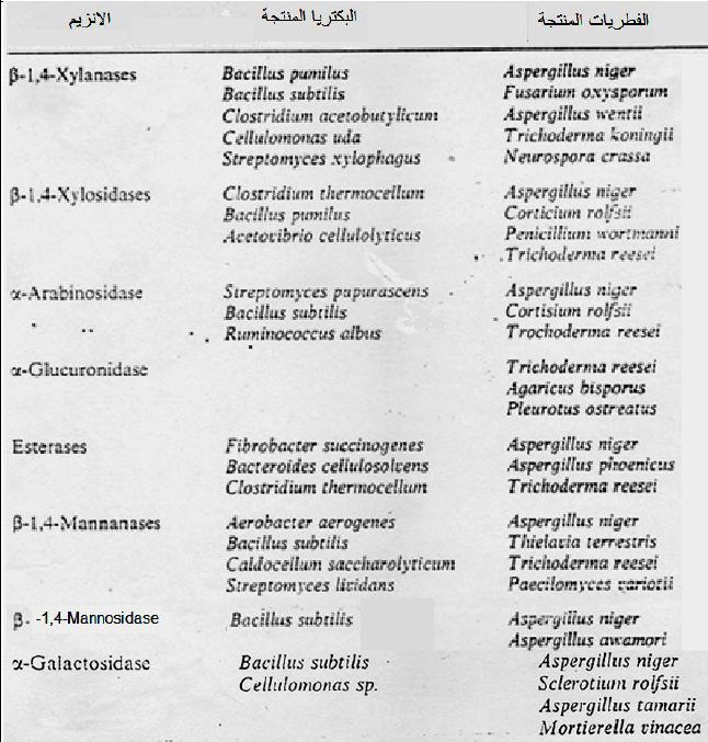خليط من الأنزيمات من Mannanases و Xyalanases وغيرها ، ذلك لأن أشباه السليلوزات مواد معقدة ومكونة من اكثر نوع من الوحدات . تقوم هذه لأنزيمات التي تعمل كأنزيمات داخلية بإنتاج سلاسل أقصر والتي تحلل إلى سكريات ب Glycosidases مثل Mannosidases ، Xylosidases ،Glucosidases وغيرها، بالإضافة إلى احتوائها على أنزيمات تقوم بفصل السلاسل الجانبية مثل الارابينوز وحامض اليورونيك و Acetyls وتنتج الأنزيمات المحللة لأشباه السليلوزات من أعداد كبيرة من الفطريات والبكتريا والبعض منها ينتج الأنزيمات بشكل أصيل والأخر بشكل مستحث، وتختلف الأحياء في نوعية أنزيماتها المنتجة والجدول التالي يوضح أهم المصادر التجارية لإنتاج أنواع مختلفة منها ومواقع تاثيرها :