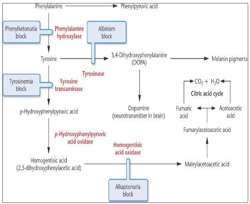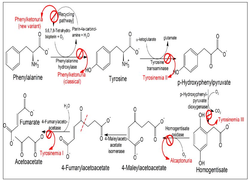 زيادة تركيز الحامض الاميني Phenylalanine عن الحد الطبيعي الذي يكون بحدود 120 ملي مول/ لتر ( 2mg/ dL )، تحدث نتيجة لنقص الانزيم الذي يحول الحامض الى التايروسين . وعند استمرار الحالة وعدم معالجتها تؤدي الى اضطرابات عقلية وتدمير الدماغ . و PKU) Phenylketonuria) هي احد انواع هذا الاضطراب ، ويمكن ان تحدث بعدة اشكال تصل الى ثمانية تتعلق بتراكم الحامض او مشتقاته واكثرها شيوعا PKU المذكورة آنفا . وتتداخل مع ايض التايروسين والاضطرابات الناتجة عن ايضه .
