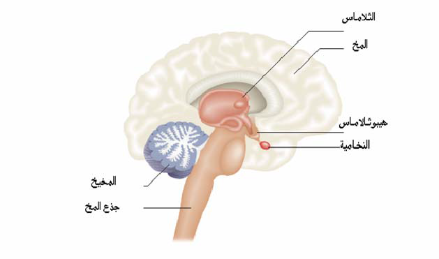 شكل رقم (4) قطاع طولي في المخ يبين مكان الثالاماس والهيبوثالاماس والغدة النخامية والمخيخ وجذع المخ