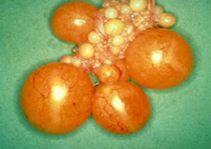 مبيض الدجاجة شكل رقم (5) بالإضافة لإنتاجه للبويضات يقوم بإفراز الهرمونات وهو في هذه الحالة يعتبر من الغدد الصماء ويفرز مبيض الدجاجة الهرمونات الاتية: