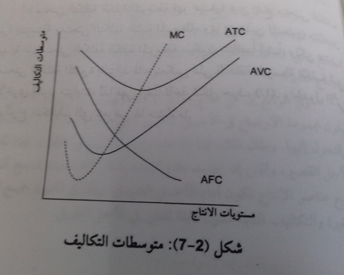 نلاحظ من الشكل البياني (2-7) ان متوسط التكلفة الثابتة يكون متناقصاً ، وكلما ازداد الناتج فانه يقترب الى المحور الأفقي لا انه لا يقطعه ، والسبب في ذلك ان زيادة الناتج تعني توزيع التكلفة الثابتة على عدد وحدات أكبر مما يجعل متوسط التكلفة الثابتة متناقصاً ، اذ ان قسمة مقدار ثابت هو التكلفة الثابتة على مقدار متزايد وهو الناتج يكون ناتج القسمة متناقصاً وهو متوسط التكلفة الثابتة .