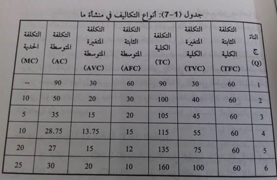 والجدول الآتي يوضح أنواع التكاليف التي تتعرض لها منشأة ما .