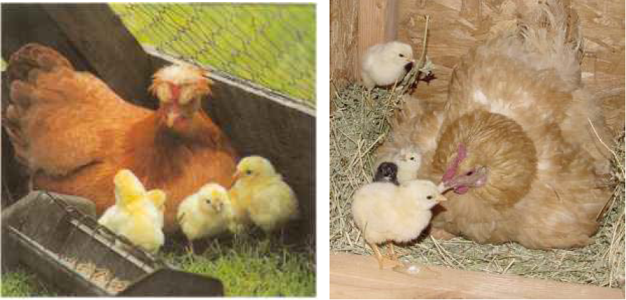 الدجاجة الأم: يجب أن تكون من عرق يرخم (يرقد) ولا تنفر لأقل سبب، وأن تكون حريصة على تربية أفراخها والاعتناء بها وهذه صفة ملازمة للدجاج البلدي، ويفضل الدجاجة التي يكون عمرها كبير لأن الدجاجة الصغيرة تكون كثيرة الحركة وعديمة الانتباه إلى صغارها وكثيرا ما تهجر البيض قبل الفقس.
