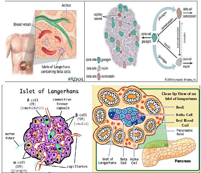 PP-Cells و D-Cells غير معروفة الوظيفة .النوع الاول (المعتمد على الانسولين) . وتحلل خلايا بتا المنتجة للانسولين هي احد اهم اسباب مرض السكري