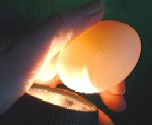 ويتم تحديد الصفات الداخلية للبيضة باستعمال مصدر ضوئي قوي وتوضع البيضة أمامه فتظهر المحتويات الداخلية للبيضة وتسمى هذه العملية باسم الفحص الضوئي شكل ( 10 ).