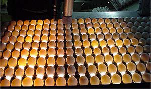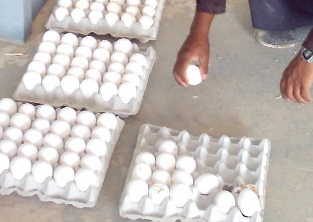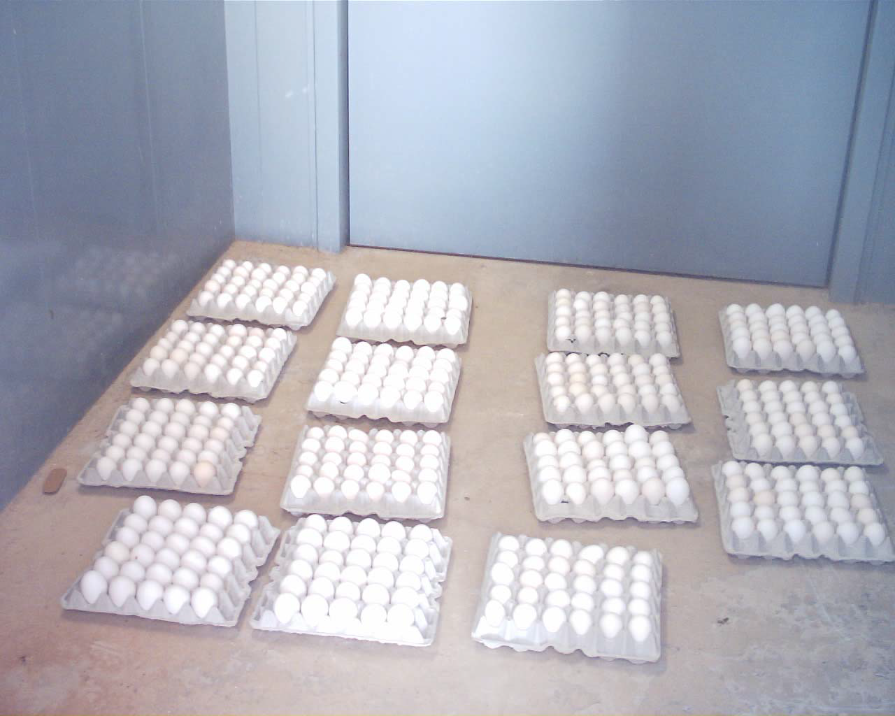 2- يوضع البيض في صواني بلاستيكية والناحية العريضة للبيضة إلى أعلى.