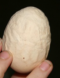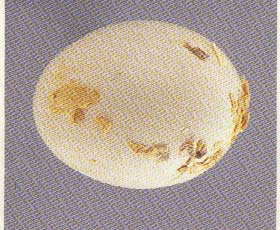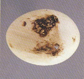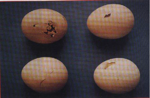 ج- جودة القشرة: البيض ذو القشرة الجيدة يعطي نسبة فقس أعلى من البيض ذي القشرة الرقيقة بالإضافة إلى ذلك فإن قشرة البيض المحتوي على عدد كبير من الثغور يفقد نسبة كبيرة من محتواه المائي بالتبخير أثناء التفريخ، شكل رقم (5) كذلك يستبعد البيض ذو القشرة السميكة شكل رقم (6) والبيض المشروخ شكل رقم ( 7 ).