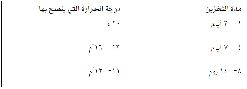 جدول رقم (1) درجات الحرارة التي ينصح باستعمالها عند تخزين بيض التفريخ: