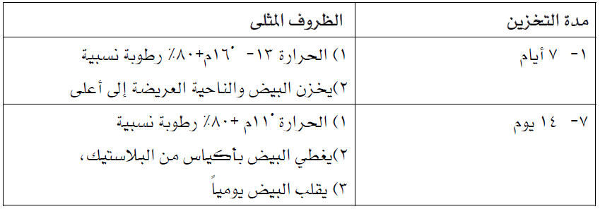 جدول رقم (۲) ملخص للظروف المثلى عند تخزين بيض التفريخ: