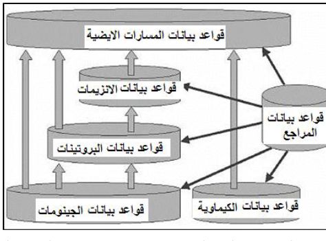 وعلى غرار ما ذكر في عمليات الاصطفاف السابقة فأن اصطفاف المسارات الايضية يحتاج الى قواعد بيانات للمقارنة معها. وقواعد بيانات الايض تحوي على المسارات الايضية وكذلك مسارات نقل الإشارات والإنزيمات والبروتينات وبيانات الجينوم وفي العموم يكون الهيكل العام لمثل هذه القواعد كما موضح في الشكل :