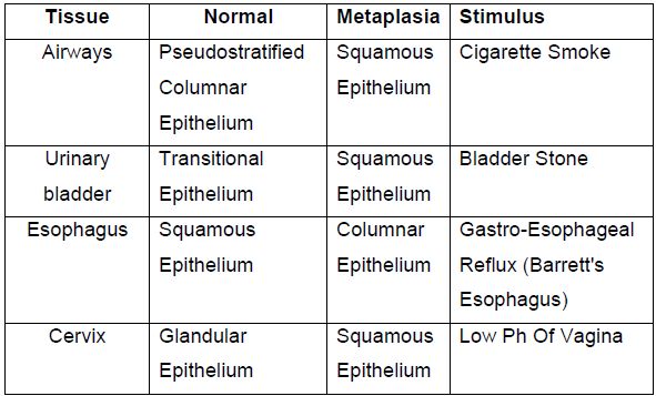 تغيرات غير طبيعية في الانسجة بحيث تتحول الخلايا الى نوع اخر غير خاصة بذاك العضو . ويعني تحول غير طبيعي لخلايا ناضجة كاملة التخصص في الانسجة من نوع الى نوع متمايز لانسجة اخرى . وتمثل الحالة نوع من انواع التكييف للخلايا استجابة للاجهادات الفسلجية والمرضية والجدول التالي يوضح بعض التحولات وتشمل تحول الخلايا الغضروفية الى عظمية او الخلايا الطبيعية الى حالة غير طبيعية .