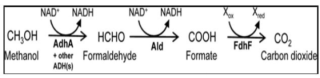 ونتيجة الأكسدة إنتاج غاز ثاني أوكسيد الكاربون بعد المرور بمرحلة الفورمالديهايد الذي يتم بواسطة أنزيم نزع الهيدروجين Methanol Dehydrogenase الذي يعد من الأنزيمات المستحثة ويكون الأنزيم المشارك ليس متخصصاً جداً.