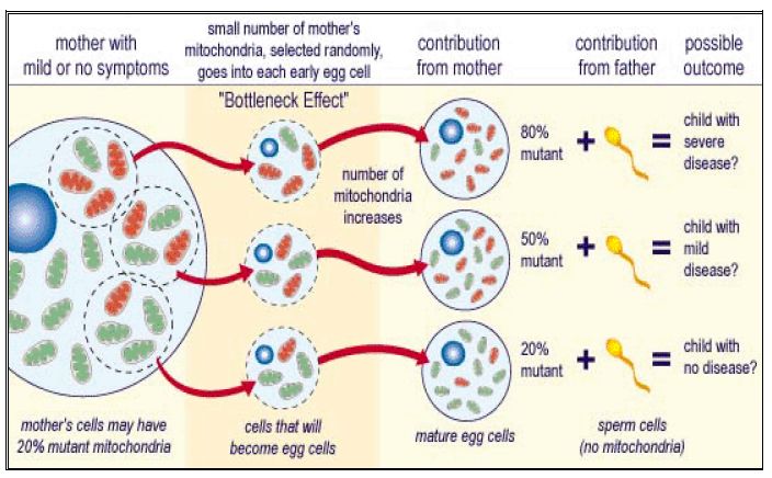 وتؤثر الطفرات بشكل كبير فيما اذا حدثت في السلاسل التنفسية التي يشارك فيها اكثر من 70 ببتيد متعدد مختلف واكثرها تخلق في السايتوبلازم بتاثير من جينات نووية ولكن الصغير منها والذي يكون بحدود 16 كيلو قاعدة يشفر لها ب mtDNA ، والامراض قد توجد في الاناث والذكور ولكنها غالبا ما تعود الى الام والبعض موضح في المخطط الاتي :