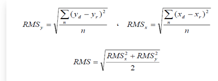 حيث n عدد النقاط, xd,yd احداثيات النقطة كما هو مسقط في البيانات الرسومية , xr,yr احداثيات النقطة كما تم تحديدها حقليا. RMSy ،RMSx جذر متوسط مربع الخطأ في الاتجاه الافقي والاتجاه الرأسي , اي الازاحة في الاتجاه الافقي والاتجاه الرأسي, وتعتبر البيانات الرسومية دقيقة كلما قلت قيمة جذر متوسط مربع الخطأ.