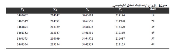 خريطة رقمية مرسومة باستخدام برنامج AutoCad مطلوب التيقن من دقتها قبل توظيفها في نظم المعلومات الجغرافي, قام المستخدم بتحديد عدد ستة نقاط على الخريطة ومضاهاتها بنظائرها في الواقع باستخدام جهاز ال GPS , الجدول التالي يبين النقاط وزواج الاحداثيات فوق الخريطة الرقمية وفي الحقل لكل نقطة من النقاط الستة.