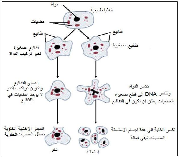 موت الخلايا المفاجئ اذ تظهر على الخلايا صفات مظهرية وفسلجية معينة ، فتظهر تغيرات في وظائف المايتوكوندريا والأغشية الخلوية بالإضافة إلى التغيرات المظهرية . واثناء عملية النخر يحصل جفاف متسارع لسايتوبلازم الخلايا مما يؤدي إلى تحطم أغشية العضيات داخلها وانطلاق أنزيمات الأجسام الحالة Lysosomes يلي ذلك تحلل الأنوية وحصول تدمير كامل للخلايا والأحداث موضحة في الشكل الآتي :
