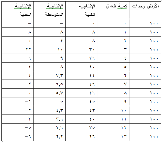 الجدول أعلاه يوضح العلاقة بين عناصر الإنتاج، والإنتاج الكلي Total production والإنتاجية المتوسطة Average production، والإنتاجية الحدية Marginal production لسلعة ما، كما هو واضح من الجدول أن مساحة الأرض ثابتة وأن وحدات العمل هي التي تتغير.