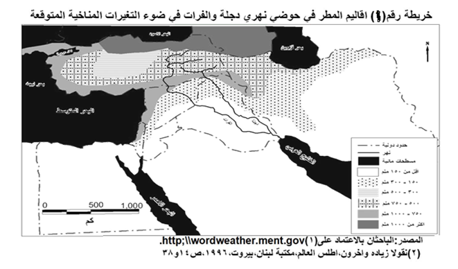 كمية الأمطار السنوية، فعلى سبيل المثال لا الحصر إن محطة ارضروم التركية كانت تستلم معدل مجموع سنوي بحدود 512 ملم خلال المدة من 1940-1980، ولكن هذا المعدل السنوي للمدة من 1927-2000 اخذ يتراجع اذ بلغ نحو410 ملم، كما إن محطات ادرنه وموغلا وسامسون تراجعت فيها كميات التساقط خلال نفس المدة من 1927-2000، اذ كانت في ادرنة 602ملم وأصبحت 586ملم وموغلا كانت 1206ملم خلال المدة 1940-1980 وأصبحت 1184ملم وسامسون كانت 735ملم وأصبحت 708ملم ومحطة ملاطيا كانت 387ملم وأصبحت 364ملم خلال المدة 1927-2000. وهذا يعني إن تناقصا في الإيراد المائي السنوي اخذ يحصل في أهم منابع دجلة والفرات، وهذه الحال أخذت تنطبق على كمية التساقط في العراق، فقد تراجعت كمية التساقط في عموم المحطات المناخية العراقية وخاصة في السنوات العشر الأخيرة من 1999 ولغاية 2008، ولعل ما حصل من شحة في كمية الأمطار خلال عامي 2007و2008 أدت إلى مزيد من الجفاف والتصحر، فقد استمرت العواصف الترابية والغبارية تضرب العراق من شماله إلى جنوبه على طول السنة، في حين إن مواسم هبوبها الطبيعية هي في فصلي الربيع والخريف.