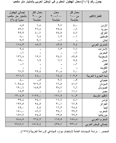 ان الموازنة المائية في غالبية الدول العربية سالبة أى ان الهطول المطري يقل كثيراً عن البخر-نتح الكامن، ويوضح الجدول رقم (1-1) معدلات الهطول المطري في الدول العربية .