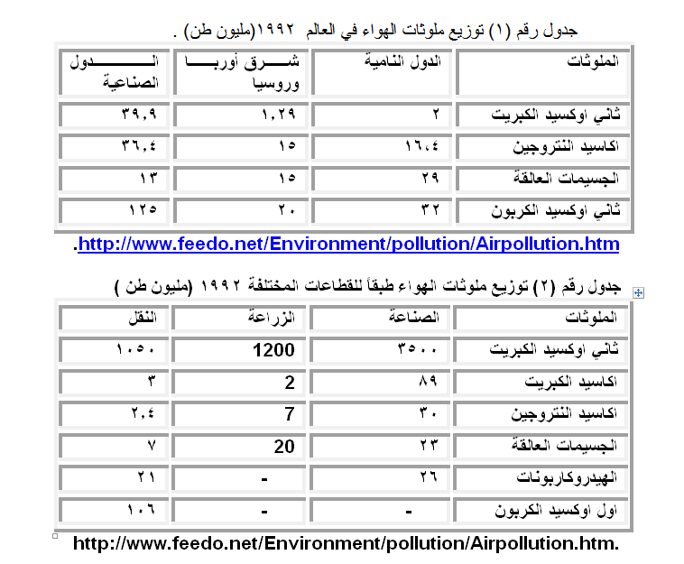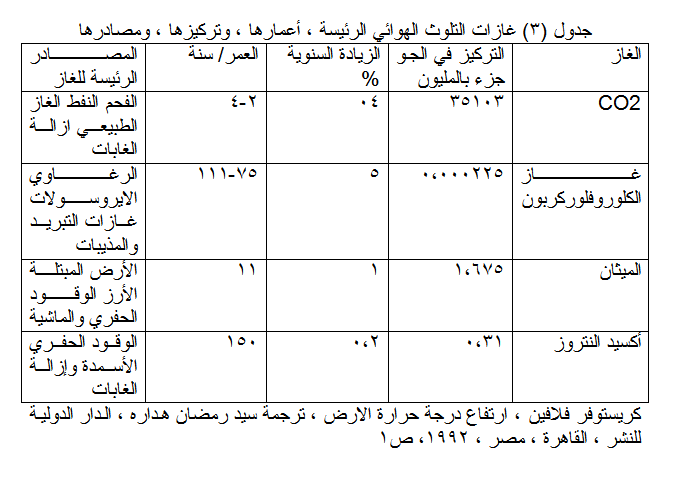 وفي المدن يتلوث الهواء من احتراق الوقود او من وسائط النقل المختلفة ، ويعد ثاني اوكسيد الكبريت من اخطر واهم ملوثات الهواء وكما هو واضح في الجدول (2) كما ان مصادر الوقود المستعملة في الصناعة والمنازل (فحم ، ومشتقات النفط) تحوي على1% من الكبريت . ويمكن لمحطة توليد كهربائية تعمل بطاقة 2000ميكاواط ان تحرق فحم وزيت يتولد من هذا الاحتراق الاف الكيلوغرامات من ثاني اوكسيد الكبريت .كما ان الغازات والملوثات التي تدخل الى الغلاف الجوي وتسبب تلوثه تختلف من حيث أعمارها ومصادرها الرئيسة ،لذا فان عملية التلوث الهوائي تزداد مع زيادة هذه الملوثات وعليه يمكن ملاحظة ان التلوث الهوائي الحاصل سوف يزداد سنة بعد أخرى بزيادة الغازات الملوثة فضلا عن الطويلة حتى يمكنها ن تتبدد في الغلاف الجوي ،لها دور في زيادة التراكمات للملوثات .وبما ان الغلاف الجوي عالمي لا تحكمه الحدود ،لذا فان تأثيرها المحلي والإقليمي والعالمي سوف يزداد وكما موضح في الجدول (3).