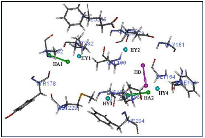 وفي الكيمياء الحاسوبية فان Pharmacophore يستعمل لتحديد المواصفات لجزيئة واحدة او اكثر لها الفعالية البايولوجية نفسها ، وبواسطة هذه التراكيب يمكن البحث في قواعد البيانات للجزيئات الكيماوية التي لها المواصفات نفسها . واهم مواصفات Pharmacophore للجزيئات ان تكون كارهة للماء وحاوية على تركيب حلقي وفيها مستلمات اواصر الهيدروجين H-bond Acceptor وهي التي تجذب الهيدروجين مثل N,O,S ولكن ليس نتروجين الاميد او Aniline او نتروجين مجموعة الامين Nitro Group ولا كبريت Sulfonyl ، واخرى معطية H-Donor وهي التي تعطي الهيدروجين وتظهر في واجهات البرامج كما في الشكل الاتي