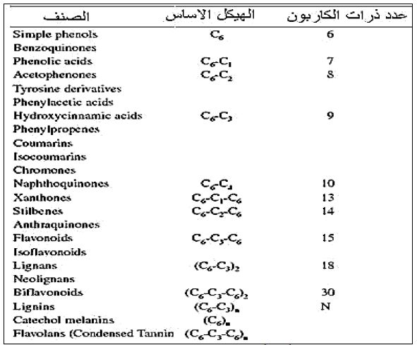 بالأحياء المجهرية وضد الاجهادات البيئية مثل الجفاف وارتفاع درجات الحرارة وزيادة طاقة الإشعاع وغيرها ولذلك فهي تشكل دفاعات نباتية مهمة . تصنف المركبات وفق التركيب الحلقي وعدد ذرات الكربون ولها سلاسل جانبية مختلفة تضفي عليها بعض الصفات مثل كراهيتها للماء وقابلية خلبها للمعادن ، وكذلك الاختلاف في قابليتها للارتباط الى البروتينات التي تعاني الأخيرة من تغيرات في شكلها نتيجة هذا الارتباط وبذا تؤثر في القنوات الأيونية عبر الأغشية وتصنف وفق الجدول التالي اعتمادا على عدد ذرات الكربون فيها :