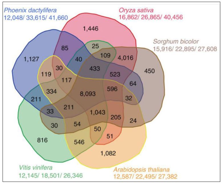 سجل عدد الجينات في ضرب الخلاص Khalas بحوالي 41660 باستعمال طرق المعلوماتية الحيوية وبرامجها . وقد تم استعمال الطرق الجزيئية الحديثة وقواعد البيانات مثل EST واجراء المقارنات لنخلة التمر مع بعض النباتات المهمة اقتصاديا (المذكورة في الشمل ادناه) ووجد ان هناك حوالي 8093 جين مشترك وهي في الغلب تمثل عمليات الايض للحوامض النووية والفعاليات الاساسية للانظمة الحيوية ، وتنفرد نخلة التمر بحوالي جين خاص بها .
