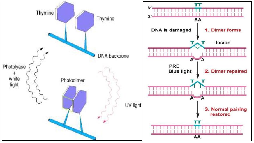 اصـــــــلاح يتـــــــم لبعض حالات العطب ويتم بنظام اصلاح مباشر وفيــــــــــــه يقوم الجين phr بالتشفير للانزيم الخاص EC 4.1.99.3) Deoxyribodipyrimidine Photolyase) وبمساعدة حامض الفوليك كمتمم انزيمي بالارتباط بمزدوج الثايمين في الظلام وعند وجود الضوء يمتص حامض الفوليك الضوء المرئي ويستعمل الطاقة لكسر الأواصر بين قواعد الثايمين المرتبطة ثم يترك الانزيم DNA .