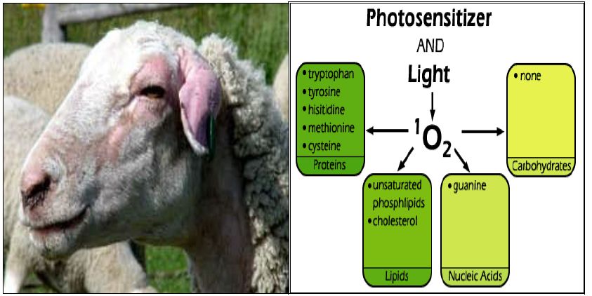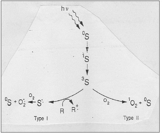 وعند التعرض للضوء تتحول المركبات إلى Electronically – Activated Triplet State التي تتفاعل مع الأوكسجين بطريقين، الثاني Type II الأكثر تأثيراً اذ ينتج المركب المتهيج -O2 ، أما التفاعل الأول Type I فإنه معقد ويؤدي إلى إنتاج أكثر من مركب مثل الأيونات (-Superoxide(O2 والبيروكسيد وجذور (.OH) ، ومثل هذه المركبات تؤثر في تراكيب الخلية مثل DNA ، والبروتينات والأغشية الخلوية اعتماداً على الموقع الذي تكون فيه حال التهيج.